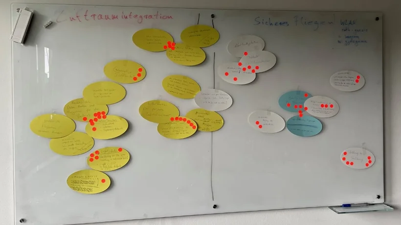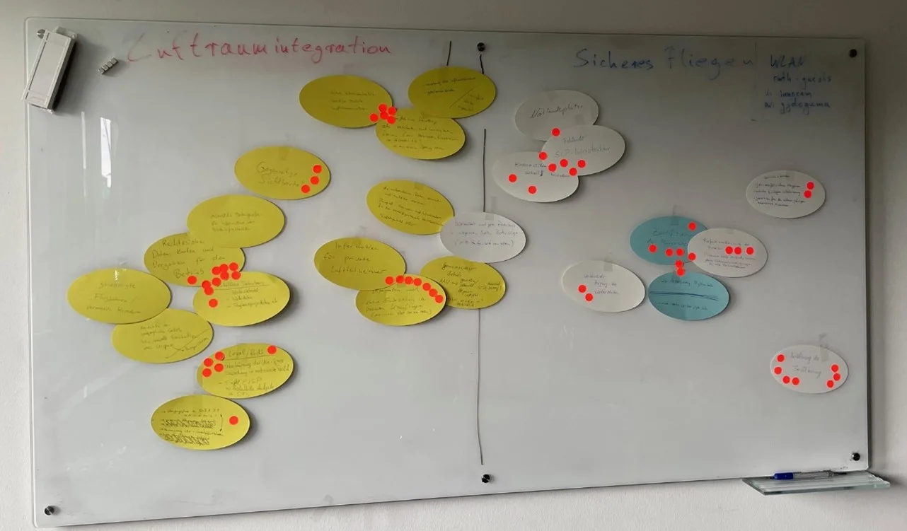Auf diesem Input aufbauend konnten relevante und aktuelle Kernthemen für den Verkehrsträger Luft mithilfe eines Brainstormings identifiziert werden. Diese wurden nach ihrem Bezug zu Luftraumintegration und sicherem Fliegen aufgeteilt und konnten von den Teilnehmern mit roten Punkten nach Relevanz bewertet werden.