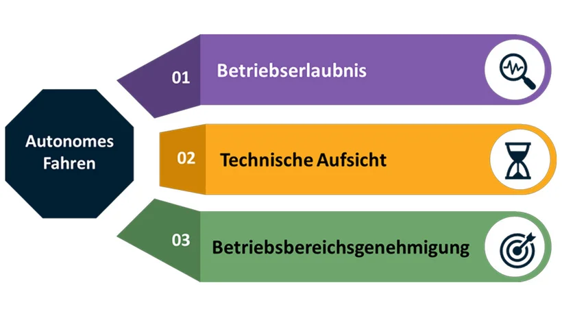 Der Bundesgesetzgeber hat drei wesentliche Anforderungen für den Betrieb von autonomen, also fahrerlosen, Fahrzeugen festgelegt, wie in der obenstehenden Darstellung skizziert. Dieser Gesetzesrahmen ist seit 2021 in Kraft[2] und die zugehörige Verordnung zur Genehmigung und zum Betrieb von Kraftfahrzeugen mit autonomer Fahrfunktion in festgelegten Betriebsbereichen (Autonome-Fahrzeuge-Genehmigungs-und-Betriebs-Verordnung - AFGBV) ist seit 2022 verabschiedet.
