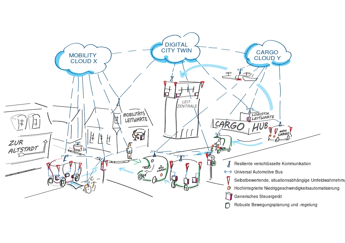 Die im Vorgängerprojekt UNICARagil erforschte und entwickelte Architektur für fahrerlose Fahrzeuge bildet dafür eine wertvolle Grundlage. Sie diente unter anderem als Orientierung für die Gesetzgebung und spiegelt sich in den Rahmenbedingungen des Gesetzes zum autonomen Fahren wider, das im Juli 2021 in Kraft trat.