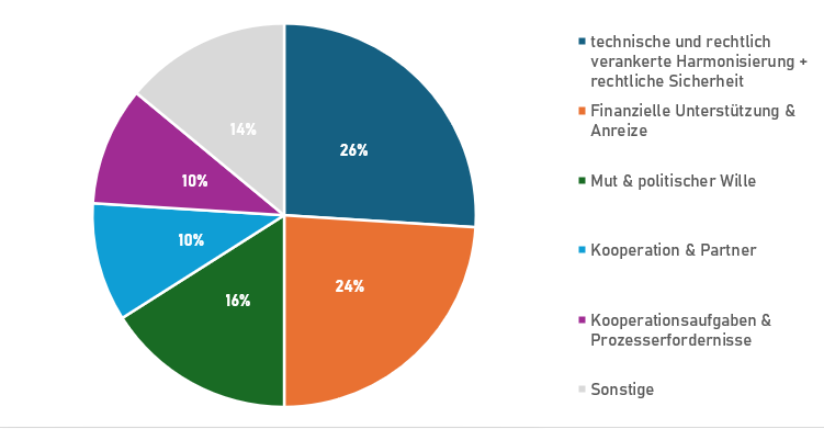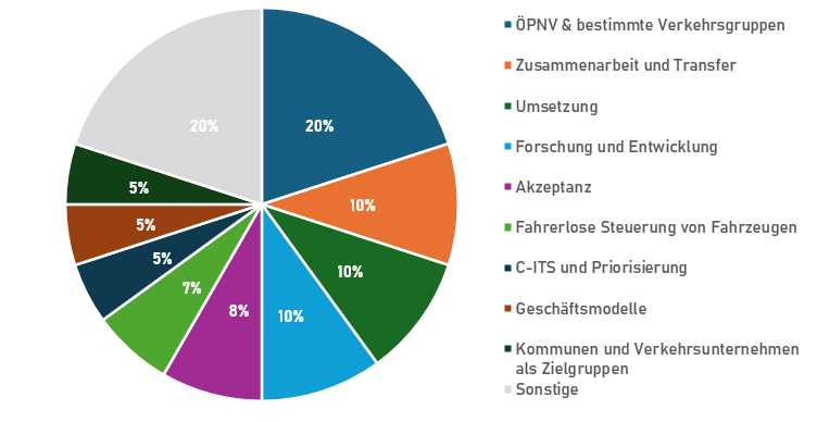 Befragt nach den Erfordernissen für das Übertragen und Skalieren ihrer eigenen Aktivitäten nannten die Teilnehmenden am häufigsten (26%) Bedarfe im Zusammenhang mit den regulatorischen Anforderungen und technisch harmonisierten Systeme, die diesen entsprechen. Dabei spiele Kenntnisse um den Rechtsrahmen wie auch die technischen Fragestellungen für die Typengenehmigung von L4-automatisierten Fahrzeugen eine wichtige Rolle. Dahinter folgten die Bedarfe rund um finanzielle Unterstützung & Anreize (24%), Mut & politischer Wille (16%) sowie Kooperation & Partner (10%) und spezifische Kooperationsaufgaben & Prozesserfordernisse (10%).