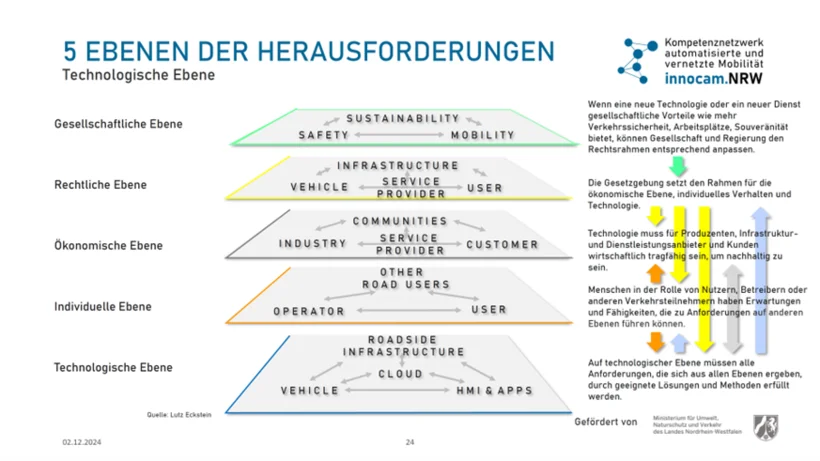 Auf der gesellschaftlichen Ebene sind ungeschriebene Erwartungen, Normen und Regeln verankert, aus denen sich beispielsweise eine Skepsis gegenüber Sensoren im öffentlichen Verkehrsraum oder gegenüber der Souveränität über die gesammelten Daten ableiten lässt. Eine der Schlussfolgerungen daraus ist die Notwendigkeit von Orientierungshilfenfür die Berücksichtigung ethischer Grundsätze bei der Gestaltung von Innovationen für automatisierte und vernetzte Mobilität. Beabsichtigte Veränderungen auf dieser Ebene können oft nur inkrementell realisiert werden. Weiterführende Informationen können Sie in diesem Bericht der Ethik-Kommission über das automatisierte und vernetzte Fahren nachlesen oder auf dieser Seite der Europäischen Union.