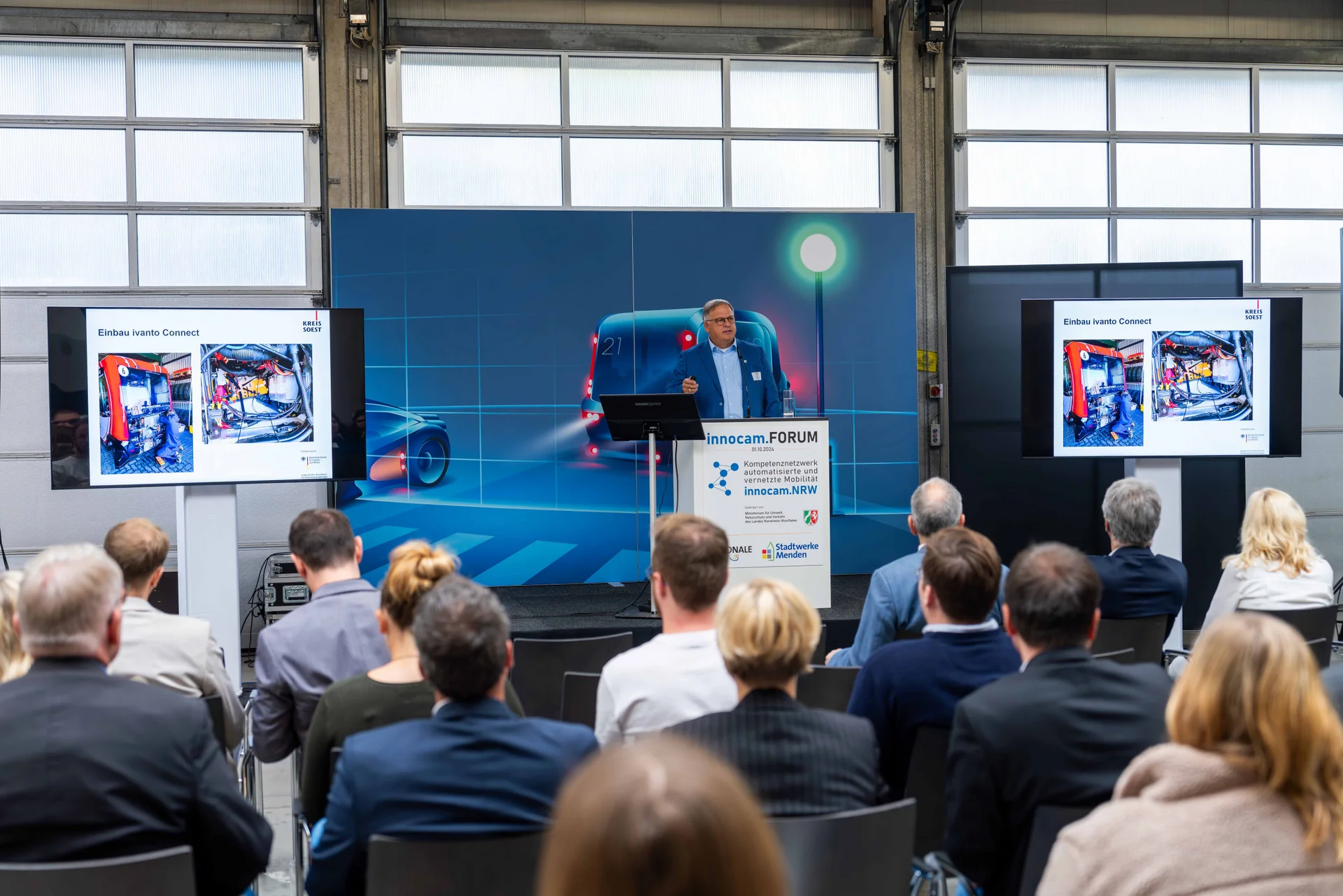 Das innocam.FORUM am 01.10. stand im Zeichen des ländlichen Raums und der Chancen und Herausforderungen, die automatisierte und vernetzte Mobilität abseits großer Städte und Ballungsräume mit sich bringen. In Kooperation mit der Südwestfalen Agentur fand die Veranstaltung in Menden, Südwestfalen in der Fahrzeughalle der Stadtwerke Menden statt, wo autonomes Fahren auch in ländlicher Umgebung getestet wird.